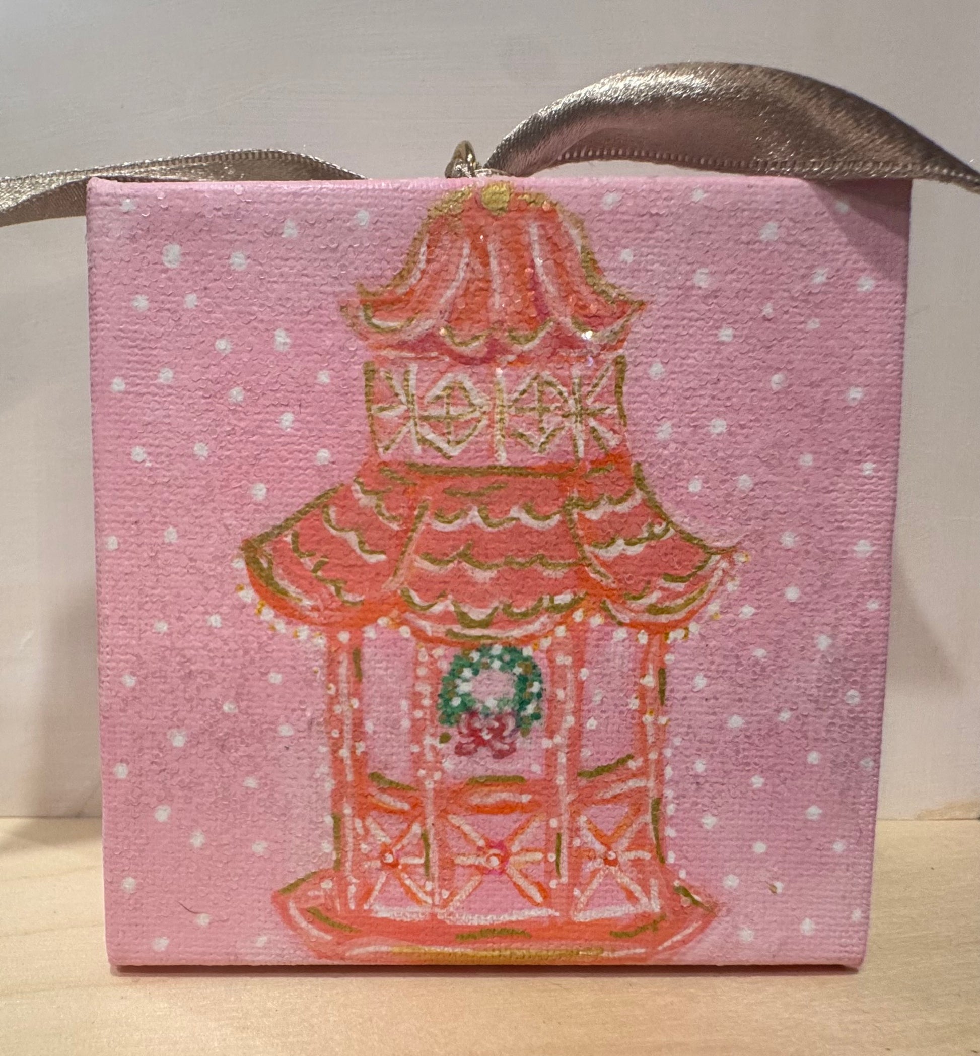 Mini Canvas Ornament - Pagoda Chinoiserie, pink and coral